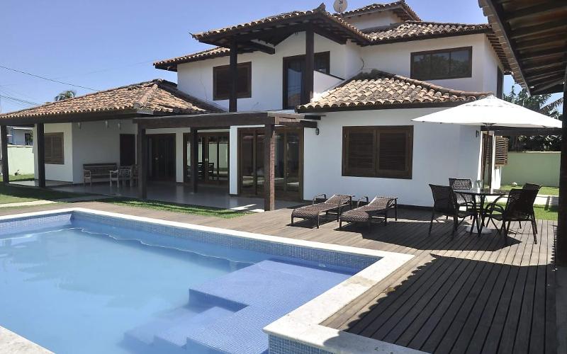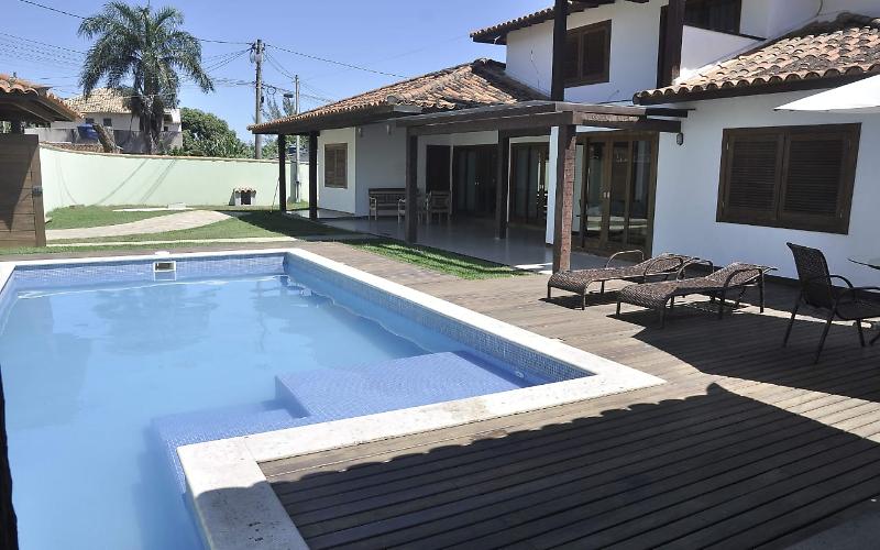 Composta de varanda, ampla sala em 2 ambientes, sala de TV, tv a cabo, wifi, 4 suítes de casal (sendo uma com hidro), todas com ar split, 1 quarto, roupa de cama e banho, cozinha ampla, muito bem equipada, área externa com deck, piscina, espaço gourmet com churrasqueira, forno de pizza e cozinha de apoio, sauna a vapor, ducha, amplo quintal e vaga para 3 carros.