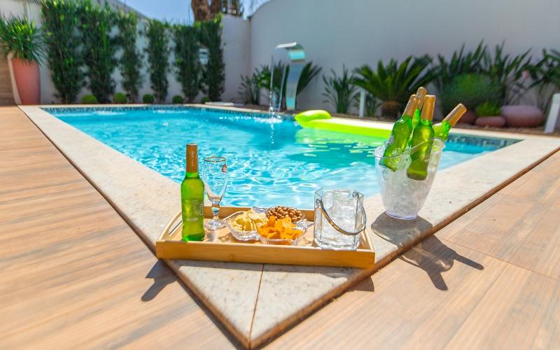 A área de lazer é o grande charme da casa: a piscina privativa, climatizada e rodeada por uma varanda com redes e sofás, convida a momentos de descanso com vista para o verde. É o espaço perfeito para reunir família e amigos em qualquer hora do dia. Integrada à piscina, a área gourmet oferece churrasqueira, fogão, geladeira e mesas para refeições, criando o cenário ideal para preparar aquele churrasco especial enquanto todos se divertem ao redor.