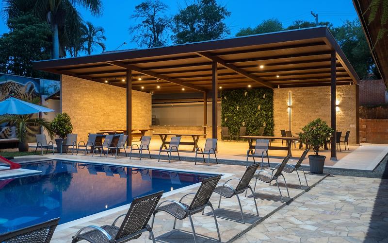 Nesse LOUNGE vc poderá receber seus convidados com mais conforto, segurança, comodidade e tudo isso concomitantemente à possibilidade de hospedar os seus convidados na casa principal de 7 suítes que tem capacidade para dormirem até 48 pessoas em camas.