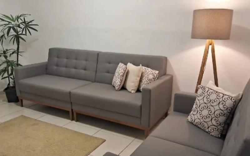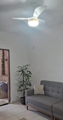 Sala de estar com 02 sofás, Tv Smart 40", Ventilador de Teto e Vídeo Game Stick.