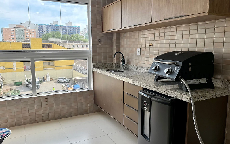 - Sacada ampla com envidraçamento, churrasqueira á gás e vista lateral para o mar.