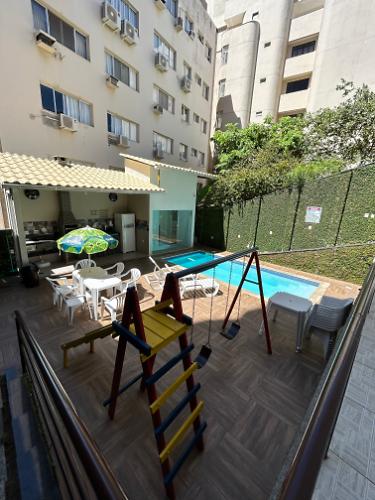 - Pavimento inferior/fundos: área de lazer (piscina, churrasqueira, 1 banheiro sem chuveiro, ducha, playground (escorregador e 2 balanços) e salão de jogos (sinuca, totó, xadrez e dardo) com churrasqueira, mesa, banco, pia e cooktop.