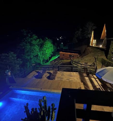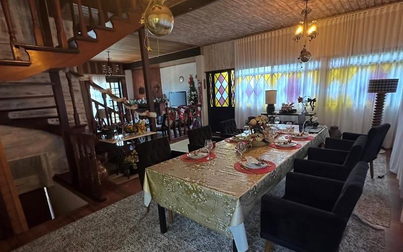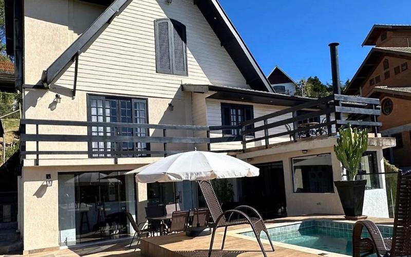 Chalé de madeira no Alto do Capivari , com 4 quartos sendo 3 suítes 1 banheiro social e 1 lavabo , sala ampla de estar ampla com lareira , sala de jantar, cozinha completa , espaço bar /gourmet com churrasqueira , forno e fogão a lenha. Deck com piscina com aquecimento e linda vista para montanha ( o aquecimento da piscina é negociado e não está incluso na diária )