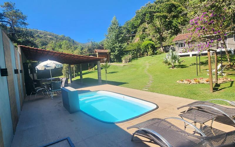 "Com uma linda vista para as montanhas, a casa moderna e super bem decorada, possui : piscina, ofurô aquecido ,área gourmet com churrasqueira e forno à lenha,academia e fire place, tudo privativo! Com 2 tv's smart de 50 polegadas, 01 suíte com varanda e vista para as montanhas,01 quarto, 01 sala de estar com lareira elétrica e, 01 lavabo, 01 banheiro(da suíte),01 banheiro externo e 01 cozinha americana com mesa de jantar, Espaço ideal para quem quer sossego e lazer com sua família e amigos!