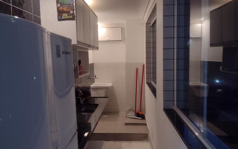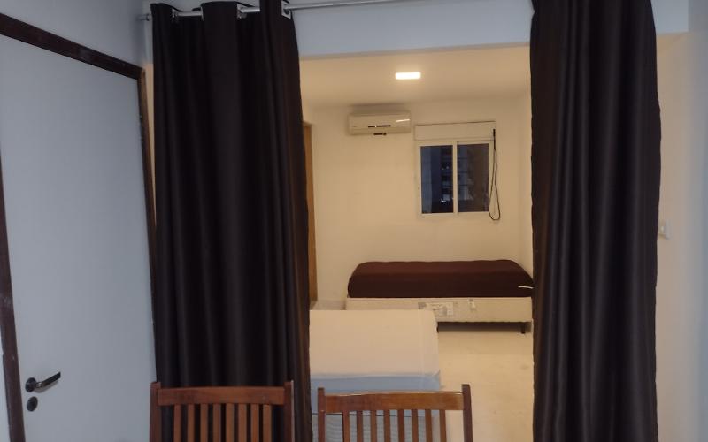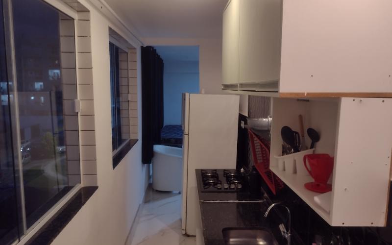 AP no terceiro andar sem varanda não tem garagem estacionar ,em frente ao prédio , uma cama de casal ,duas de solteiro cabe até sei se por dois colchões avulso com ar condicionado e Wi-fi , na sala ventilador de parede , uma cozinha compacta , com utensílios , pratos copos , talheres , liquidificador , geladeira fogão