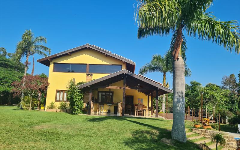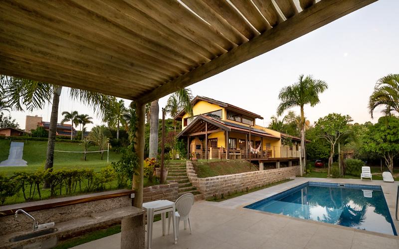 Situada em chácara de 5 mil m2 com muito verde e a apenas 130 km de São Paulo, esta casa de campo acomoda confortavelmente 26 pessoas em 11 quartos, equipados com ar-condicionado e ventilador de teto. Por todo o ambiente se distribuem 5 banheiros com chuveiros elétricos. Piscina construída em alvenaria, climatizada e iluminada, com área elevada (prainha) para crianças e rede de vôlei, está situada em amplo espaço ocupado por dois quiosques. A área social é composta de sala de jantar e estar, com pé direito duplo, integrada à cozinha, à sala de TV (a cabo) e ao mezanino (com mesa de sinuca). A churrasqueira se localiza na área da varanda, que se prolonga em um lindo deck construído em madeira, de 40 m2. A maior parte dos quartos situa-se no entorno de um pátio central com piso formado por pequenos tijolos. Sinal de internet é disponibilizado por cabo de fibra ótica de 500Mb, inclusive na área da piscina. Há um acesso especial à piscina para cadeirantes e carrinhos de bebê. Outras atrações disponíveis: quadras de vôlei e de tênis, área exclusiva para pingue-pongue e tanquinho de areia para crianças. A chácara dispõe ainda de um escorregador em lona irrigado com água corrente em área gramada em declive. Cozinha equipada com fogão semi industrial, duas geladeiras, uma delas com porta de vidro, um freezer horizontal, uma máquina de fazer gelo, um forno de micro-ondas, além de utensílios com capacidade de servir 30 pessoas. Área de serviço com máquina de lavar com capacidade de 15 quilos.
